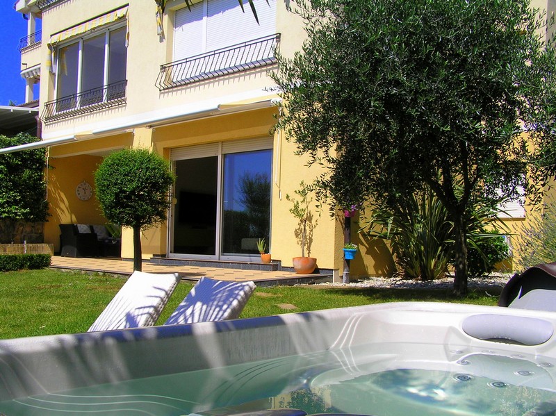 This apartment is situated on the ground floor of a modern house in a quiet location that offers a nice view of the sea. The apartment can comfortably accommodate up to six guests. It had one double room, one single room, and one childrens room, a fully equipped kitchen, and a large living room with sofa bed for two. In front of the apartment there is a nice garden with lawn and jacuzzi. The apartment is located above the old town of Volosko, and the center of Opatija is at approx. 1,5 km distance. The apartment has a private parking as well.